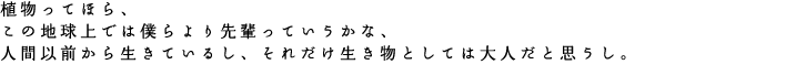 最初におこなった展覧会でもお客さんに「どこの山に住んでいるの?」「この葉っぱ、どこで拾うの?」って聞かれたけど「これキラー通りです」って。僕、ほら、青山で生まれて育ったから、あの辺りの街路樹って、結構きれいで。そんな事が面白くてね。人が驚いたり、そういう事が魅力で、結局今も作品を創っているのかなぁ。それに植物ってほら、この地球上では僕らよりずっと先輩っていうのかな、人間以前から生きているし、それだけ生き物としては大人だと思うし。だから僕たち人間は、休みになると自然の中に入って、癒されようと入って、それを拒否する事なく受け入れてくれる。そういう自然の凄さ、奥深さを感じてます。